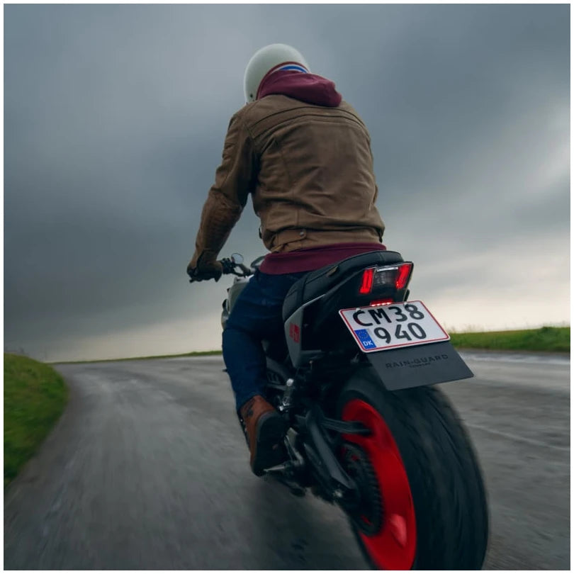 RAIN-GUARD er en smart og minimalistisk løsning til kørsel i regnvejr. Den diskrete konstruktion placeres bag nummerpladen og integreres naturligt i motorcyklens design uden at tiltrække opmærksomhed.