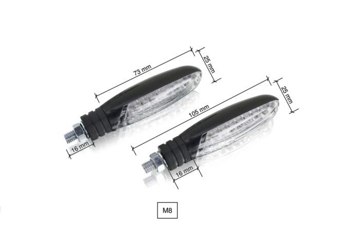 Puig LED blinklygte sæt Model Cigar er et kompakt og stilrent blinklys med klart glas og moderne LED-teknologi. Det slanke design giver et diskret og opdateret udtryk, samtidig med at lysstyrken sikrer tydelig signalgivning.